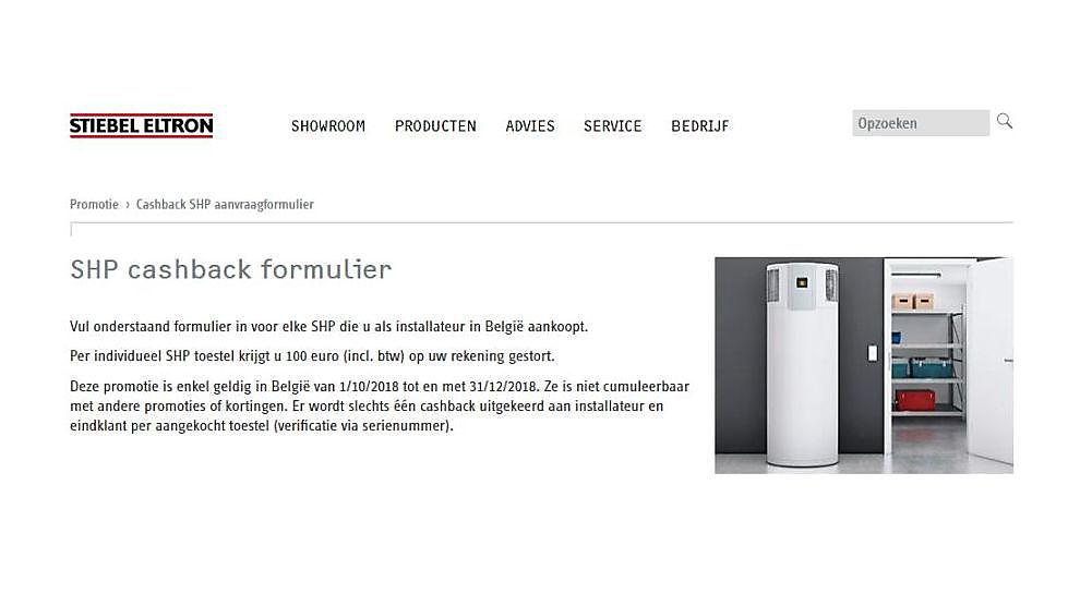 Momenteel loopt er een cashbackactie op de SHP warmtepompboiler waarbij zowel u, als installateur, als de eindklant elk 100 euro cashback krijgen. Deze dubbele cashback is geldig op een SHP aangekocht tussen 1/10/2018 en 31/12/2018. Als installateur kunt u de cashback van 100 euro (incl. btw) claimen door het aanvraagformulier in te vullen op www.stiebel-eltron.be/nl/duurzaam-verwarmen/promotie/SHP-cashback-form.html. Dit kan voor ieder individueel toestel dat u aankoopt in België. Informeer ook zeker uw eindklanten over de cashbackpromo voor particulieren. Zij kunnen hun cashbackcheque downloaden via www.stiebel-eltron.be/cashback-warmtepompboiler. De SHP warmtepompboiler is niet alleen snel geplaatst, maar garandeert ook een tevreden klant. De eindklant bespaart op zijn energiefactuur en heeft altijd zicht op het energieverbruik. Bovendien heeft hij een grote hoeveelheid warm water ter beschikking, en dat in een geruisloos toestel met een lange levensduur.