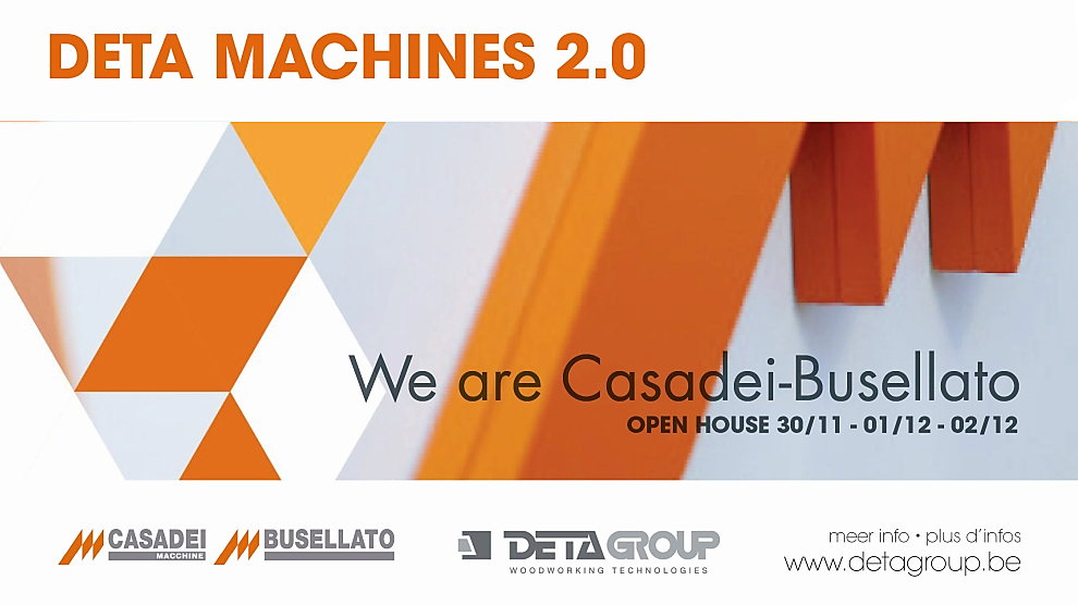 Reorganisaties bij SCM Group hebben ook voor DETA Machines gevolgen. Als gevolg van een doorgedreven rebranding verdwijnt de significante rode kleur van de merken SCM en MiniMax (die sinds jaar en dag door DETA Machines in België worden verdeeld). Vanaf nu worden deze machines verdeeld via twee parallelle verkoopkanalen: enerzijds is er de businessunit “SCM” (met bijhorende blauwe logo’s) en de businessunit “Casadei-Busellato” (met oranje logo’s). Vanaf 1 oktober 2017 verkrijgt DETA Machines de invoerrechten en exclusieve verdeling voor België voor het volledige machinegamma Casadei-Busellato. Voortaan zijn de machines dus niet langer rood of blauw, maar… oranje. Different name, different colour, same service... DETA Machines treedt op als invoerder voor de Casadei-Busellato machines voor België en zal deze verdelen enerzijds rechtstreeks naar de eindklanten en anderzijds via verdelers geografisch verspreid over heel België. DETA Machines kijkt met vertrouwen naar de toekomst en nodigt u uit op haar jaarlijkse opendeurdagen, op donderdag 30 november, vrijdag 1 en zaterdag 2 december 2017.